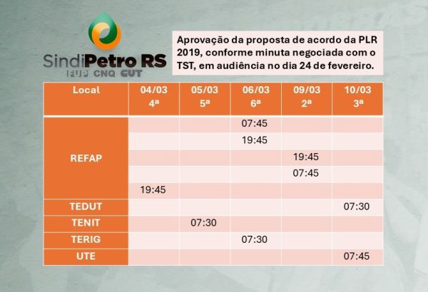 1) Aprovação da proposta de acordo da PLR 2019, conforme minuta negociada com o TST, em audiência no dia 24 de fevereiro.
