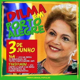 A presidenta Dilma Rousseff estará em Porto Alegre nesta sexta-feira, 03 de junho, para participar do Ato em Defesa da Democracia, no Teatro Dante Barone, na Assembleia Legislativa do Estado, às 16h.